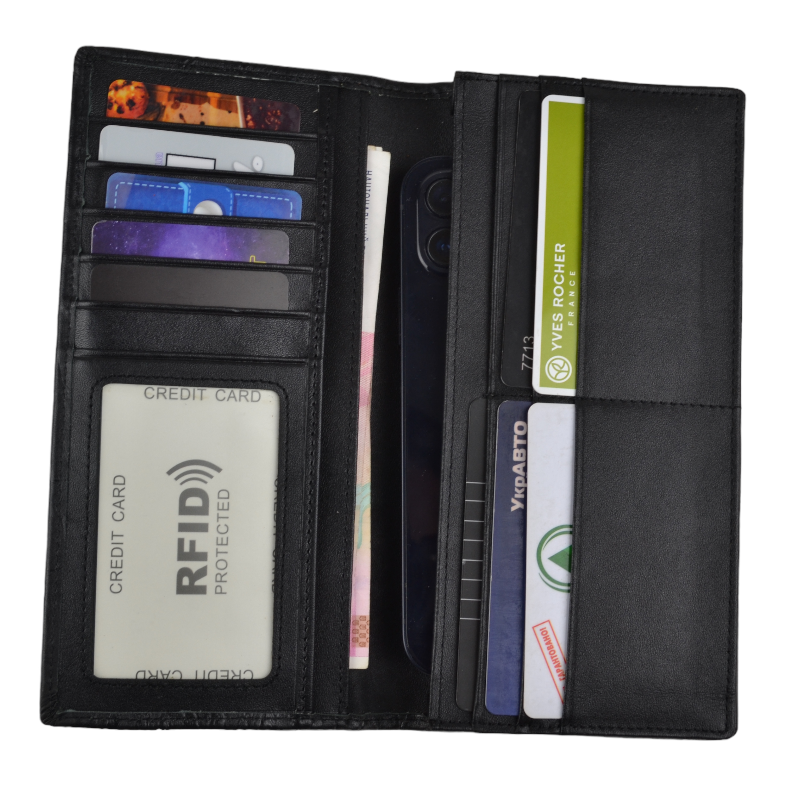 С размерами 18,5 на 9,5 см, этот длинный и вместительный кошелек создан для эффективной организации вашего пространства. Внутри расположены отсек под купюры, 11 отделений для карт, 1 прозрачное отделение для фотографии или документа, а также практичное "сендвич отделение" для мелких предметов.